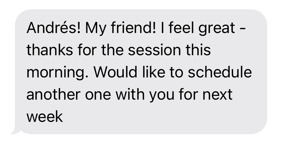 I found Andres at a time when I had a lot of low back pain that had not responded to massage or traditional physical therapy. Within two sessions with him, my back pain was gone AND Andres helped me understand that it was a lack of strength in my lower body that was the root cause of the pain. In order to really heal, I needed to get stronger - and with Andres' help, I did.